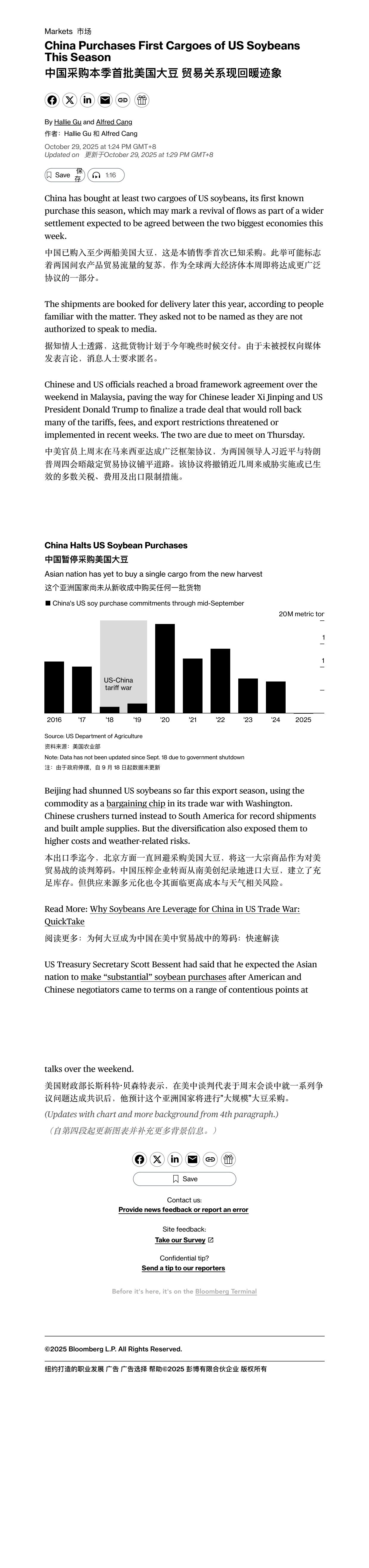 中国在本季首次采购美国大豆 正值特朗普与习近平会晤前夕——彭博社