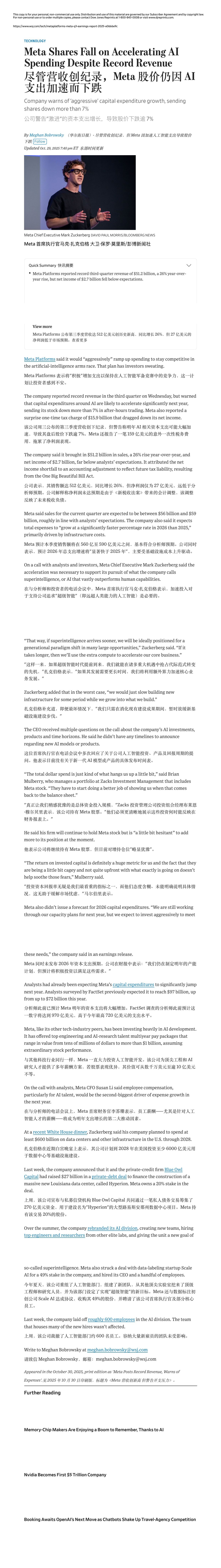 Meta 股价因 AI 支出加速增长而下跌 尽管营收创新高——华尔街日报