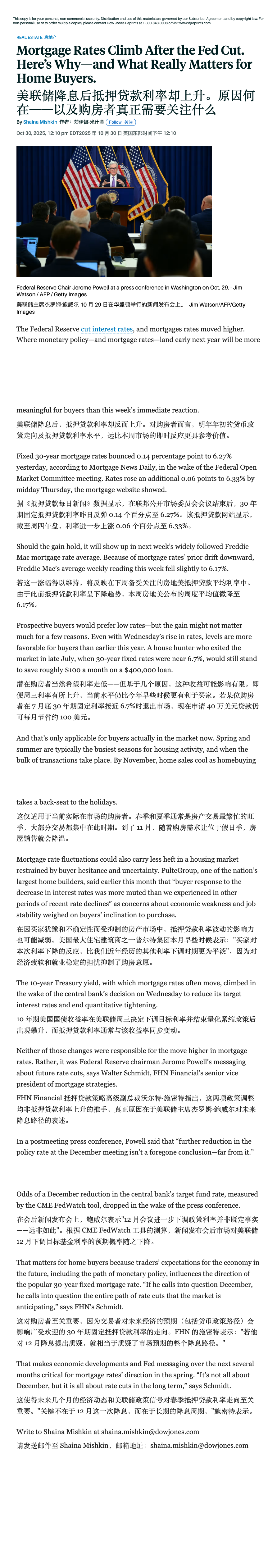 美联储降息后抵押贷款利率却攀升。原因何在?对购房者真正重要的是什么?- 《巴伦周刊》