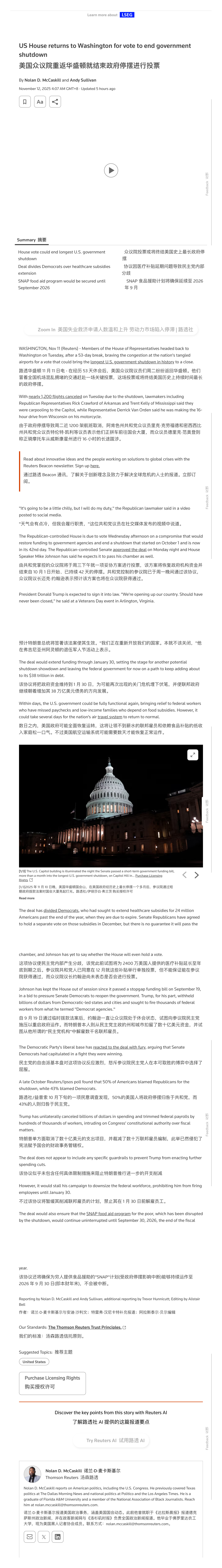 美国众议院返回华盛顿就结束政府停摆进行投票 - 路透社
