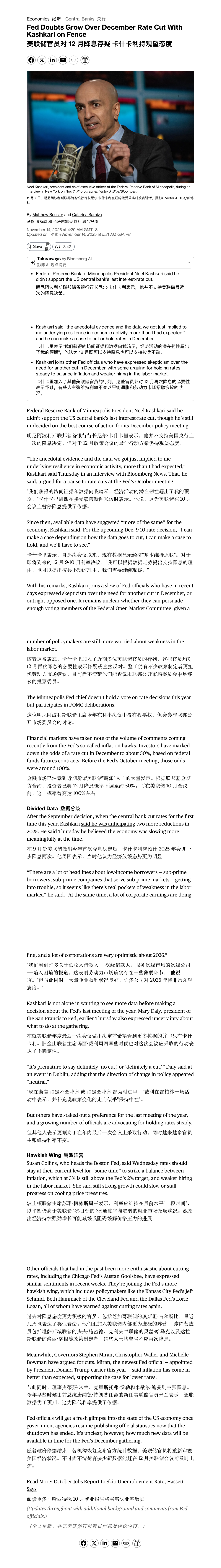 美联储 12 月降息疑虑升温 卡什卡利持观望态度. - 彭博社